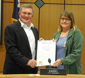 Treasurer, Liz Reinhardt, with Gatesville City Manager, William Parry, accepting a proclamation for the month of April proclaiming the month as "Sustainable Environment Month" for the City of Gatesville, Texas.