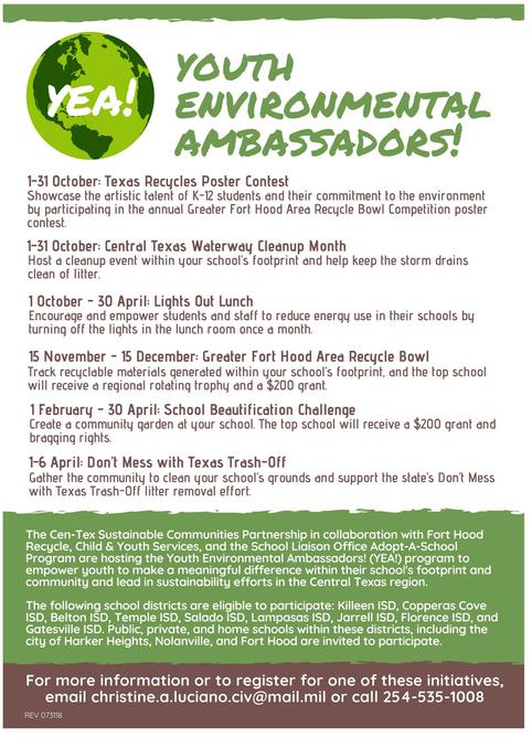 The Cen-Tex Sustainability Partnership serves as a forum to combine regional sustainability efforts to improve the overall quality of life and economic vitality of the Central Texas region and its citizens. Members include Fort Hood and the Cities of Copperas Cove, Gatesville, Harker Heights, Killeen, Belton, Nolanville and Lampassas.